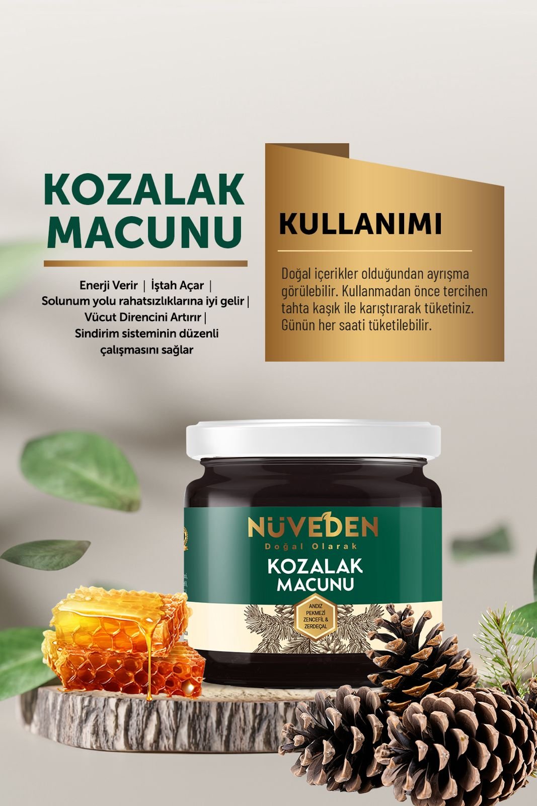 Nüveden Kozalak Macunu, doğanın şifalı bileşenlerini bir araya getirerek hazırlanmış özel bir karışımdır. İçeriğinde yer alan çiçek balı, kozalak şurubu, andız pekmezi, keçiboynuzu pekmezi, keçiboynuzu tozu, zerdeçal, zencefil, havlıcan, kebabiye, nane, karanfil ve C vitamini (askorbik asit) sayesinde vücut direncini artırmaya yardımcı olur.